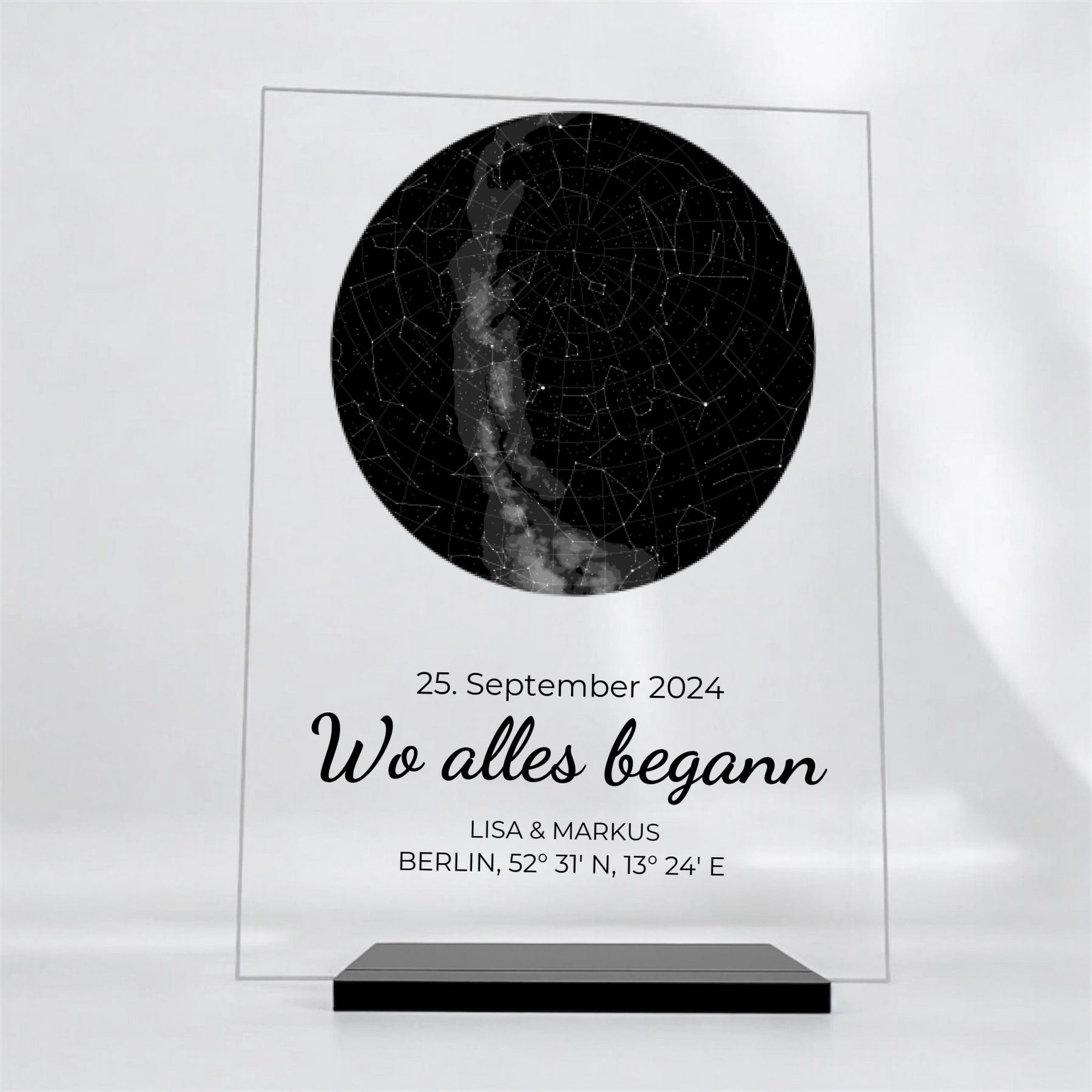 Haltet euren magischen Moment fest: Dieses edle Acrylglas-Display in A4 Größe zeigt den Sternenhimmel genau zu eurem Datum und Ort – als runde Himmelskarte mit Titelzeile, Namen und Koordinaten. Ein zeitloses Erinnerungsstück für erstes Date, Verlobung, Hochzeit oder den Tag, an dem sich alles verändert hat.